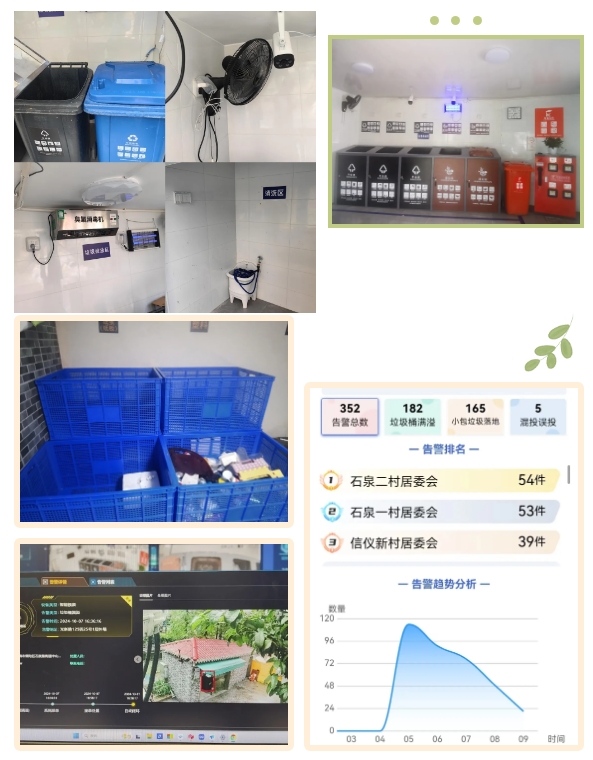 垃圾厢房引入了智能监控系统,智能识别小包垃圾落地、垃圾桶满溢、不分类投放等多种场景。可回收物投口细化为玻、金、塑、纸、衣等,进一步引导居民更精准、更便捷投放。通过对垃圾厢房的改造,厢房外观焕然一新,小区整体卫生环境整洁也有了改观,提高了居民垃圾分类投放的积极性和满意度。