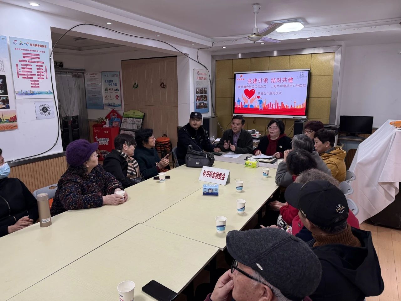 签约仪式上,秋月枫舍居民区党总支书记郑晓军介绍了居民区的基本情况和当前工作的重点。上海华尔康星杰口腔医院社会公益部经理沈溢介绍了华尔康口腔的概况,并分享了华尔康口腔的党建特色,强调了党组织在发展中的引领作用,以及党建工作推动医院公益服务不断深化的具体举措。