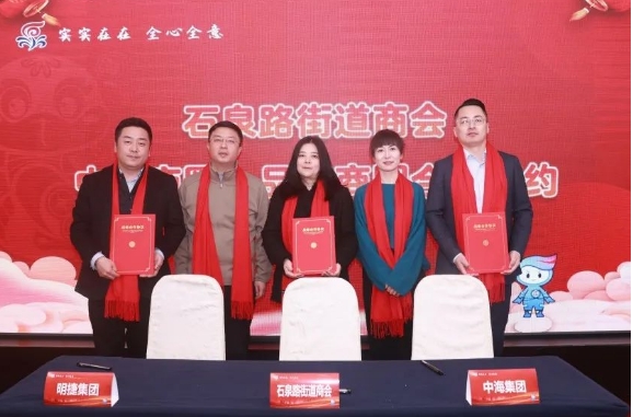 石泉路街道商会与上海中海地产商业管理公司、上海明捷置业有限公司合作签约,石泉路街道党工委书记吕升昂,普陀区工商联副主席薛颖见证签约仪式。