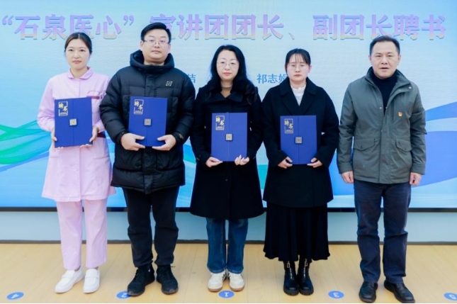 普陀区石泉街道社区卫生服务中心主任李涛为周佶、宋雯、顾佳倩、祁志娟颁发团长、副团长聘书。