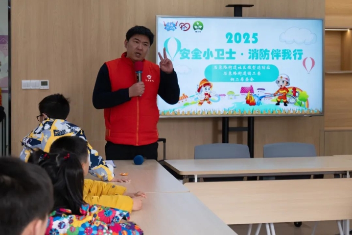 活动现场,石泉路街道社区微型消防站的消防员为孩子们带来一堂生动的消防安全课,结合家庭、学校等日常生活场景,用通俗易懂的语言讲解火灾隐患的预防、火场逃生的“弯腰捂鼻”法则、灭火器的“提、拔、握、压”四步操作法等实用知识,孩子们认真聆听,积极互动。