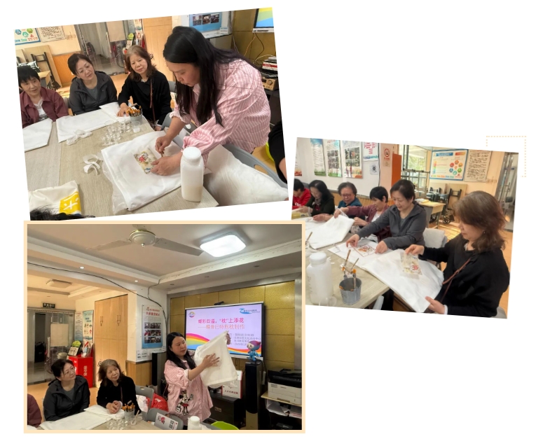 在老师耐心指导下,大家相互帮助,积极交流经验心得,共同体验手工制作的乐趣,感受邻里间的温暖情谊。经过一番努力,一个个独一无二的蝶骨巴特抱枕在大家手中诞生,现场欢声笑语不断,洋溢着温馨欢乐的氛围。