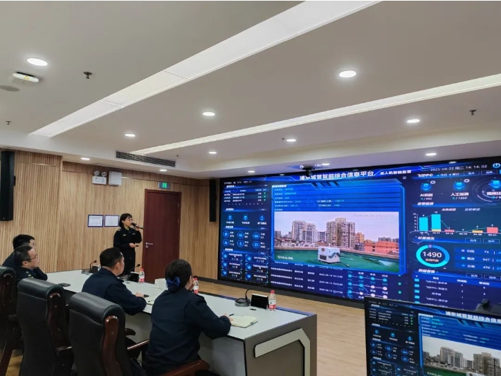 在浦东新区城市管理综合行政执法局信息指挥中心,石泉中队现场观摩“浦东城管智能综合信息平台”,详细了解浦东城管无人机智能监管的机场布局、覆盖区域、监管事项以及常态巡航、计划申航、专项援航等日常巡查流程。