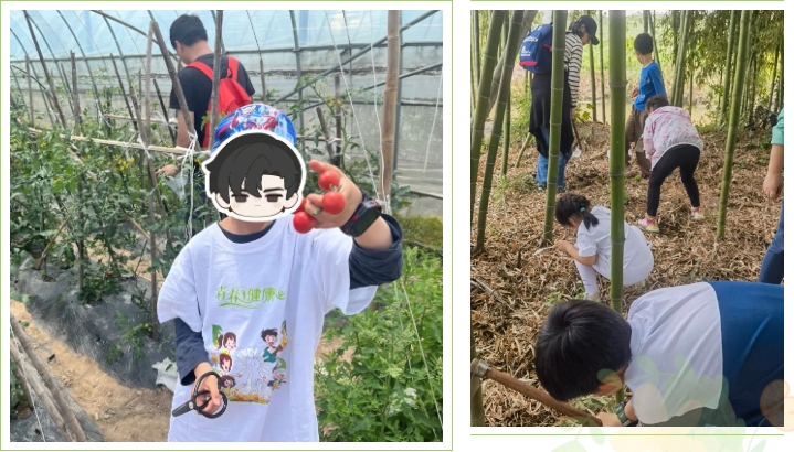 除了投喂小动物之外,孩子们提起小菜篮走进菜园里采摘新鲜蔬果,通过工作人员的讲解,认识了解了各类蔬菜的生长种植常识,在生动的实践中体验生活与劳作。