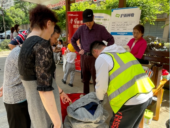 旧书刊过秤后送入专用打包箱,毛绒玩具分类打包,金属制品叮叮当当落入回收筐……居委会工作人员穿梭人群呼吁居民前来回收,为大家说明回收价格,透明公示的标价,让拎着大包小包的居民吃下“定心丸”。