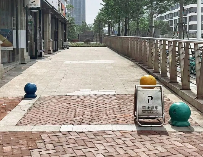 一是通过将石墩向内侧移动一米,打造“通透式阻车栏”,并放置禁止停车告示牌,既解决机动车碾压路面的隐患,又提升了空间感。