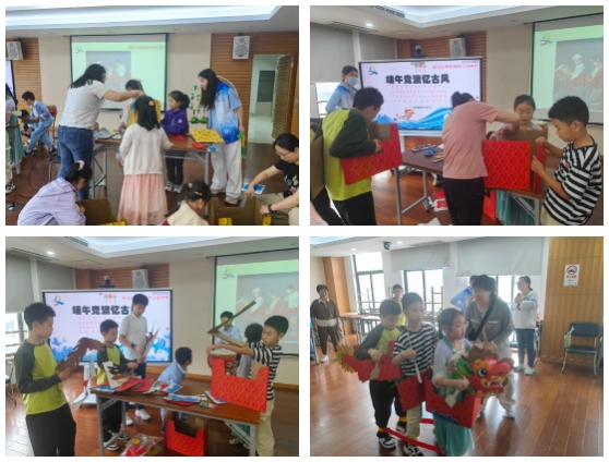 最激动人心的龙舟竞渡环节,志愿者将亲子家庭分为两组,将事先准备好的“安康红龙”“吉祥黄龙”的旱龙舟材料分发到各个小组手中。孩子们分工明确,有的负责搬运零件,有的仔细研究组装图纸,有的则小心翼翼地拼接部件,家长们也纷纷上前帮忙,在大家的共同努力下,一艘艘栩栩如生的旱龙舟逐渐成型。看着自己亲手组装的成果,孩子们脸上洋溢着自豪的笑容。