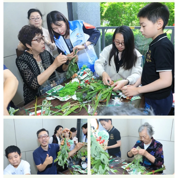 现场更设香囊DIY区,居民亲手缝制驱疫香囊,将“未病先防”理念融入生活。中国银行真如支行带领居民编织艾草挂饰,一缠一绕间传递“避邪纳福”的美好祈愿。共建单位以专业服务守护居民健康,让节日更添安心底色。