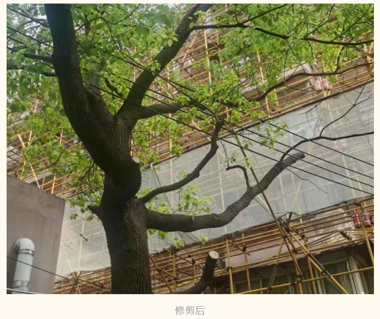 考虑到台风季的迫近和居民的急切期盼,为彻底消除安全隐患,加快问题解决进程,街道管理办主动跨前一步,在绿化部门的指导下,迅速组织专业绿化作业队伍,制定科学修剪方案,对遮挡居民窗户、存在安全隐患的过密枝、过长枝、枯死枝进行了彻底清理。
