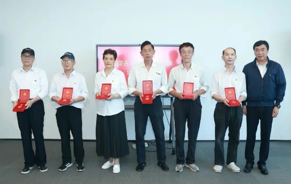 张伟为老党员代表颁发“光荣在党50年”纪念章。