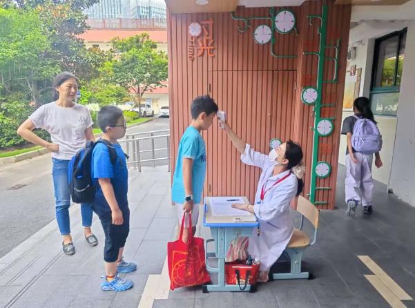 走进校门,孩子们在街道爱心暑托班的展板下合影留念,并在志愿者的指引下与家长进行签到、测量体温后进入教室,一切井然有序。