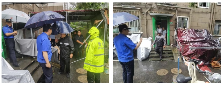 面对迫在眉睫的险情,石泉路街道综合行政执法队果断出击,联合居委会、物业组成应急小组,顶风冒雨开展整治。执法队员现场对居民进行安全教育,强调台风天户外设施的极端危险性;居委干部逐户劝说老人撤离;物业人员快速拆除,并同步清理周边杂物。三方协同发力,仅用半天时间便将两处帐篷彻底拆除,消除了这一“悬在头顶的定时炸弹”。