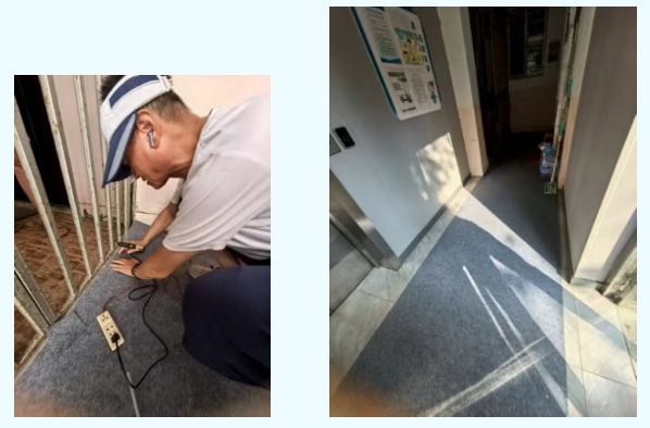 加装电梯工程本是让居民欢欣鼓舞的喜事,却让家住岚皋路166弄的何师傅老两口平添了一桩心事。原来,连着电梯的走廊虽然铺设了带有防滑设计的瓷砖,但年近八旬的两位老人走在上面总觉得脚下不稳。特别是遇到阴雨天气,瓷砖表面容易返潮,每次出门都要扶着墙壁小心翼翼地挪步,生怕一个不小心摔出意外。这对老夫妻的孩子都在外地工作,平时生活起居全靠自己打理。加装电梯后,原本以为上下楼方便了,没想到走廊地面又成了新的困扰。抱着试试看的心态,老两口找到了负责他们楼组的块长缪文君。听完老人的诉说,她立即意识到问题的严重性。“老人家摔跤可不是小事,我们得马上想办法解决。”并立即协调申请防滑毯。当天另一位社工杜德龙特意带着工具来到何师傅家门口,仔细测量走廊尺寸,用美工刀精准裁剪防滑毯。铺设时,他反复检查每个边角,确保毯子平整贴合地面,不留任何可能绊倒老人的隐患。