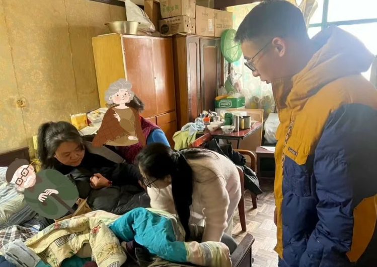 接到电话的社工张勤莉立即带着同事一路小跑赶往薛大爷家中。大家一边轻声安抚,一边小心查看情况,确认老人意识清醒后,两人合力慢慢将他抱起,平稳放到床上,并立刻拨打120,详细说明了老人的病史和当前症状,为急救争取了宝贵时间。