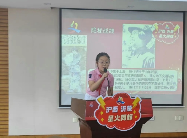 在讲述环节,石泉的孩子们纷纷走上讲台,讲述他们心目中的沂蒙英雄。红嫂,这位用乳汁救伤员的伟大女性,她的无私奉献和英勇无畏,成为了孩子们心中的英雄典范;战斗英雄们在战场上冲锋陷阵、舍生忘死的事迹,让孩子们感受到了英雄的力量和担当;而陈若克,这位从沪西工厂里走来,最终牺牲在沂蒙的烈士,她的故事更是让孩子们深刻体会到了临沪两地红脉相连、生死与共的革命情谊。“我们上海市的第一任市长陈毅曾经说过,淮海战役胜利离不开山东群众的支援,淮海战役的胜利是人民用小推车推出来的......”小朋友们用稚嫩而真挚的声音,讲述着英雄们的故事,传递着对英雄的敬仰和缅怀之情。