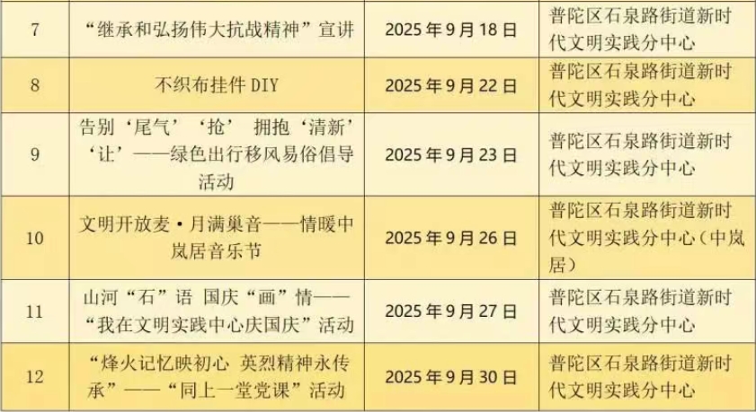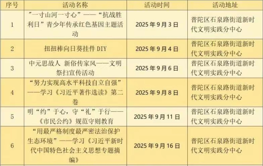 石泉路街道新时代文明实践分中心活动安排表