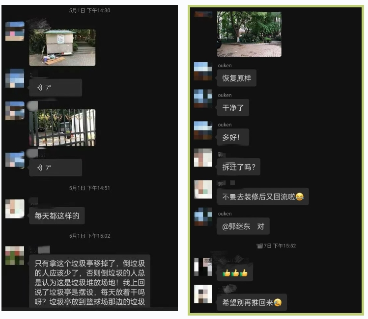 孟妍便在群里发起议事:“为了配合垃圾分类工作,我们小区至少要有2个垃圾投放点,大家觉得如何设定本点位比较合理?我们一起出谋划策。”整楼半数以上的居民参与讨论,在收集、整理了居民的意见后,孟妍及时与物业沟通,并与该楼居民充分互动、沟通了解诉求,督促物业调整该垃圾投放点管理方案,决定将该移动垃圾厢房移除,但保留该垃圾投放点,定时、定点投放垃圾。“以前反映问题要等好几天,现在群里说一声,问题很快就解决!”“及时发现——快速处置——闭环反馈”,就这样,凝聚力悄悄涨了起来。