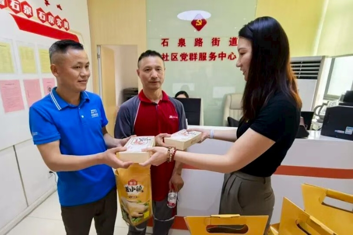 秋天的一块月饼,不是来自远方的牵挂,而是来自身边社区的温暖。在中秋节来临之际,铜川街区党支部提前准备了一份特别的礼物——来自共建单位快发公司下属企业中华老字号“悦来芳”的非遗月饼礼盒。三位街区书记将这些月饼送到了辖区内的外卖、快递骑手等新就业群体代表手中。一位外卖骑手接过礼盒时,脸上露出惊喜的笑容:“我平时给顾客送月饼的时候多,头一回自己能收到!等下回去和小伙伴们一起品尝,大家心里一定特别暖!”这份甜蜜,不仅暖了胃,更暖了心,让在异乡打拼的他们尝到了“家”的味道。