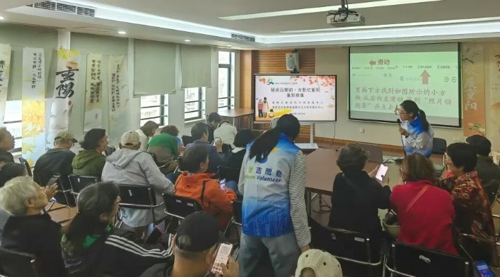 “您看,这是我和姐妹淘的旧照片,你能教我怎么在照片里拥抱吗!”大一志愿者手把手教老人如何操作。当屏幕上旧照片里的老朋友紧紧相拥,阿姨激动得眼眶发红:“都快30年了,好怀念当年!”另一个阿姨翻出双胞胎孙女的艺术照,经过志愿者的妙手,她的两个孙女在手机里跳起舞来,忍不住感叹:“原来手机还能这么用!以后想孙女了,就打开这个相册‘看看’她们小时候。”