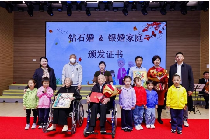 活动在浪漫的《婚礼进行曲》中拉开帷幕。钻石婚和银婚家庭代表手挽手走上红毯,接受全场祝福。中福会托儿党总支书记、副所长许敏霞,石泉路街道人大工委副主任赵健为他们颁发证书,可爱的孩子们为他们送上鲜花与礼物,场面温馨动人。