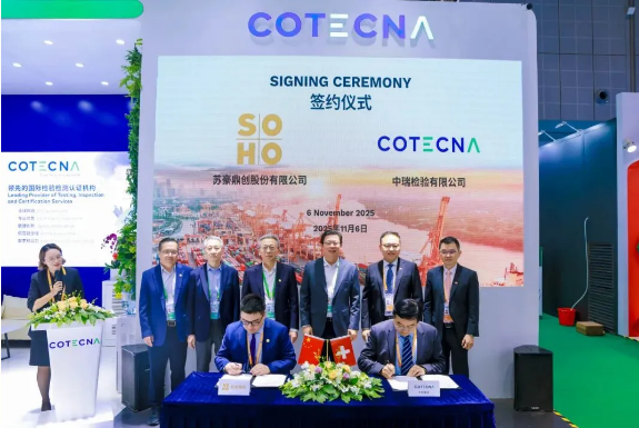 中瑞检验(Cotecna集团)作为石泉路街道重点楼宇企业,深耕检验检测认证领域五十余年,在食品、农产品、金属矿产品、消费品等多领域拥有全球服务能力与行业领先实力。11月6日下午,在中瑞检验展台上,中瑞检验有限公司与苏豪鼎创股份有限公司签订战略合作协议。