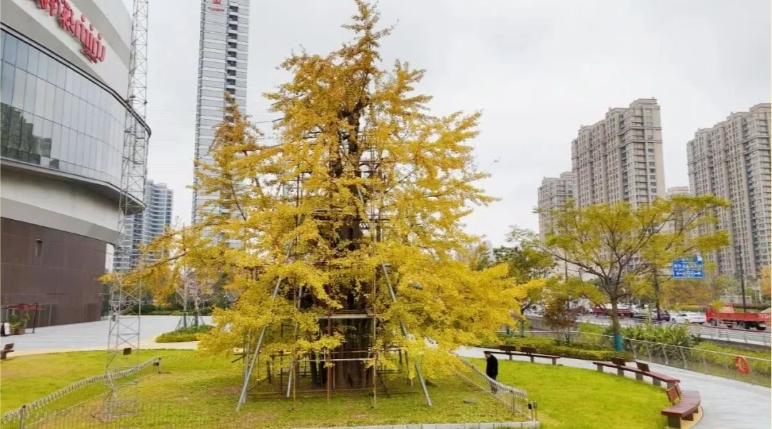 银杏树编号为0057,高18.5米,胸围2.7米,冠幅东西向和南北向各9米。别看眼前这棵银杏树嫩绿如新,其实历经了500多年的岁月变迁。为了让古树名木“老有所依”,街道林长办积极配合区林长办,指导古树养护单位园开公司,实施专业养护。2023年底,随着中海环宇城MAX的盛大开业,银杏树周边环境焕然一新,被精心打造成为银杏广场,为市民提供了一个休闲娱乐的优美空间,展现了宜居的生态环境,让古树与现代都市生活完美融合。