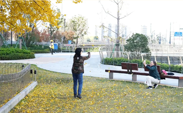 对于附近的居民而言,这棵树不仅是景观,更是生活的一部分——每年这个时节,金黄的叶片随风飘落,在广场地面铺就一层松软的地毯,吸引着散步的居民放慢脚步。许多居民每年都会来看看这棵树,“之前颜色还是蛮青的,今天看已经是金黄色的了,现在是银杏最漂亮的时间。你看它的树根,要几个人才围得住,一般的银杏没有这个效果。”
