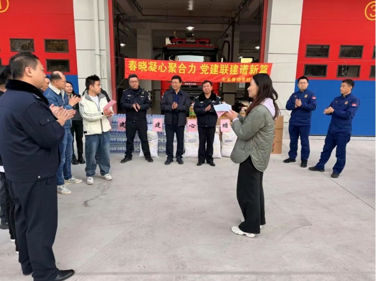 活动伊始,慰问仪式迅速拉近了彼此距离。消防指战员以整齐划一的队列、挺拔如松的站姿,铮铮铁骨,列阵于前,展现出新时代“火焰蓝”队伍严明的纪律作风和昂扬的战斗精神,尽显应急救援先锋的忠诚本色与专业素养。紧接着,石泉春晓党群服务站负责人向常年奋战在灭火救援、抢险救灾一线的全体消防指战员致以崇高敬意和诚挚慰问,并阐述了此次共建活动旨在加深了解、促进协作、共同提升社区消防安全治理水平的初衷。