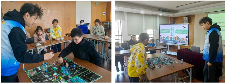 “这个蓝色的牌子,上面画着小人走路,是什么意思呀?”在“交通标识识别”环节,志愿者拿出“迷你交通岗”模型——红绿灯、斑马线、指示牌一应俱全,20块常见交通标识牌铺满桌面。
