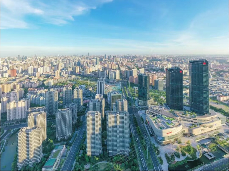 其中A/B座双子塔设计灵感源自真如寺青瓦坡檐,拥有玻璃幕墙、40米环幕落客区,获LEED铂金与WELL金级双认证。C座已整售,D/C/E三座独栋同步租售,为企业提供“天际总部”空间。中海中心以“未来之塔”对话千年古塔,重塑上海西区商务格局。
