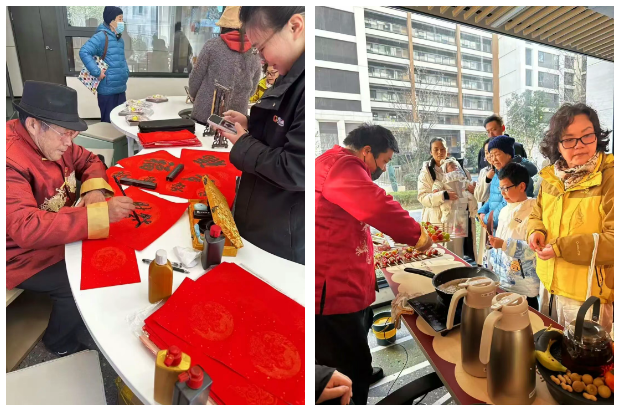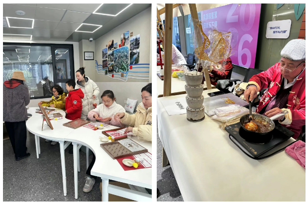 大家亲手拓印“福”字、书写春联,把新年祝福带回家。不少居民围坐一起缝制草木香囊,艾草清香沁人心脾。现场还设置了围炉煮茶区,茶香袅袅,邻里闲话家常,暖意融融。