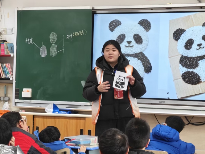在筑牢安全防线的基础上,寒托班聚焦孩子们的科学探索欲与创造力。在探梦科技课堂上,志愿者以“种子贴画”为创意载体,为孩子们介绍各类种子的名称、形态与生长习性,手把手示范种子贴画的制作步骤。孩子们全神贯注、巧妙构思,小心翼翼地将普通的种子变成一幅幅创意满满的熊猫贴画,在指尖操作中感受自然的奥秘与艺术的美感。
