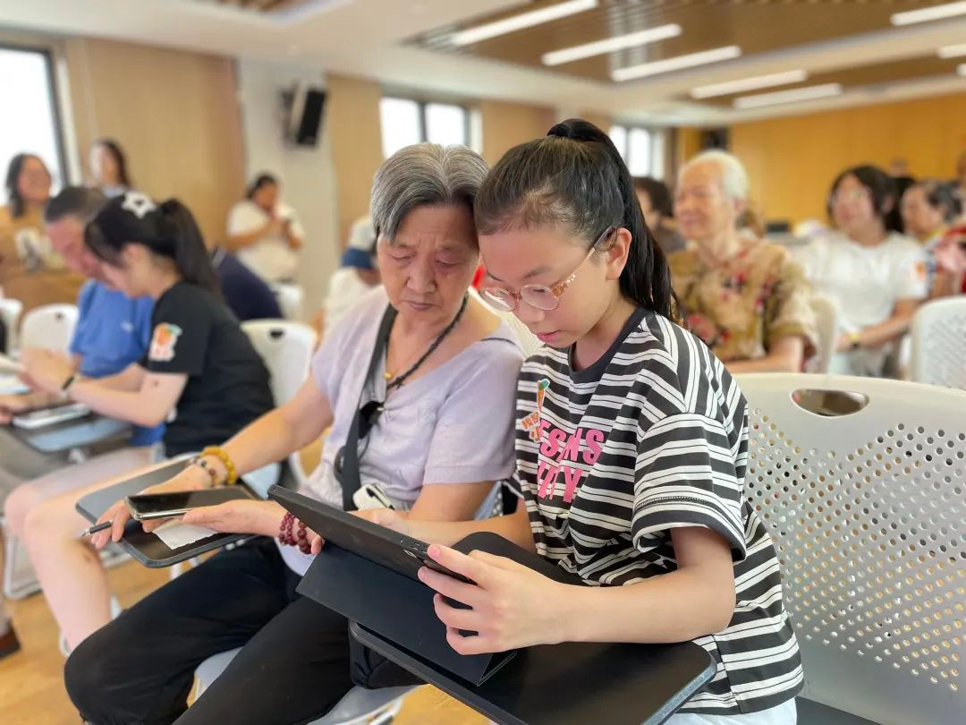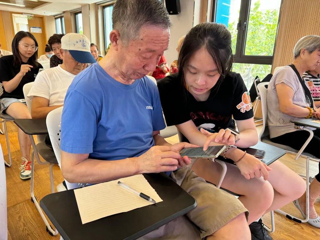 这是在桃浦镇老龄办携手桃浦镇社区基金会开展的“智趣银龄新时代·畅享数字乐生活”长者智能技术运用提升行动”系列活动现场。老年人化身“老宝贝”,成为追赶数字时代弄潮儿,“小桔子帮帮团”的青少年成员们变身“科技小老师”,进行“角色反串”开展智能手机教学活动。
