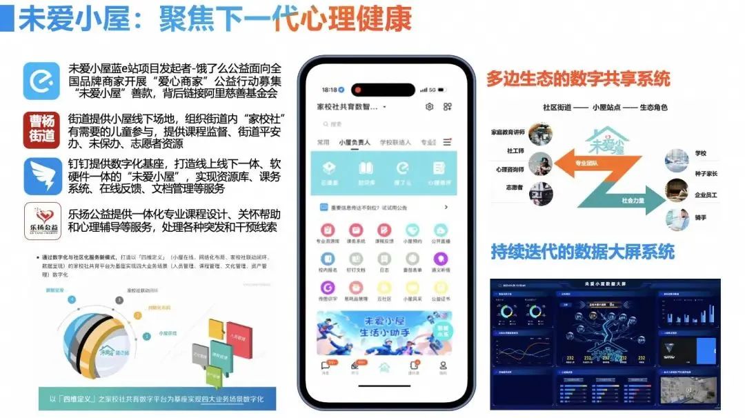 与此同时,饿了么积极关注社区“一老一小”的安全与健康问题,饿了么、钉钉与曹杨新村街道共同发起“e起未爱”公益计划,在杏山路妇女儿童中心设置“旗舰点”,还合力建设“未爱小屋·蓝e站”服务点,打造集心理、服务、管理、公益等应用于一体的专业线上工作台,立足儿童关爱与家庭亲子教育专业服务,探索数字化与社区化服务新模式。