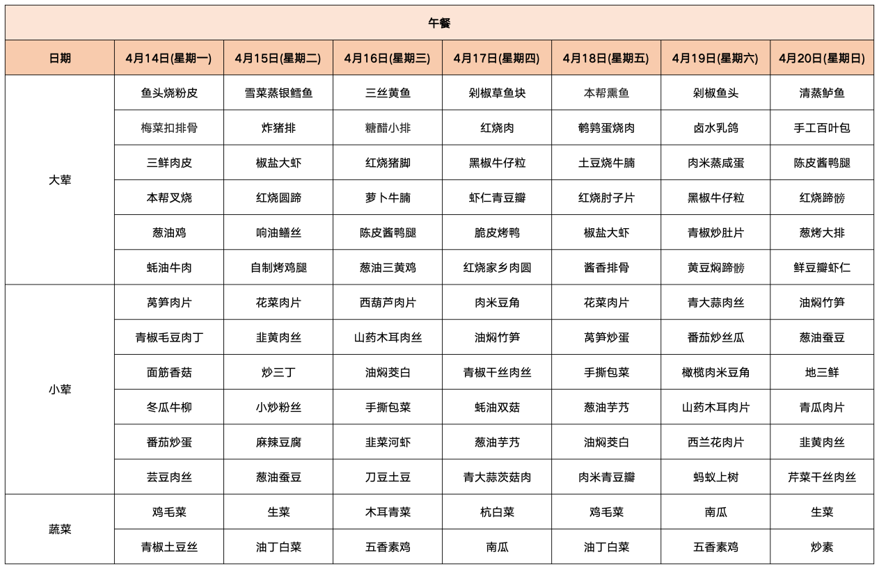 【TOP菜谱】桃浦社区食堂一周菜谱抢先看(4.14-4.20)
