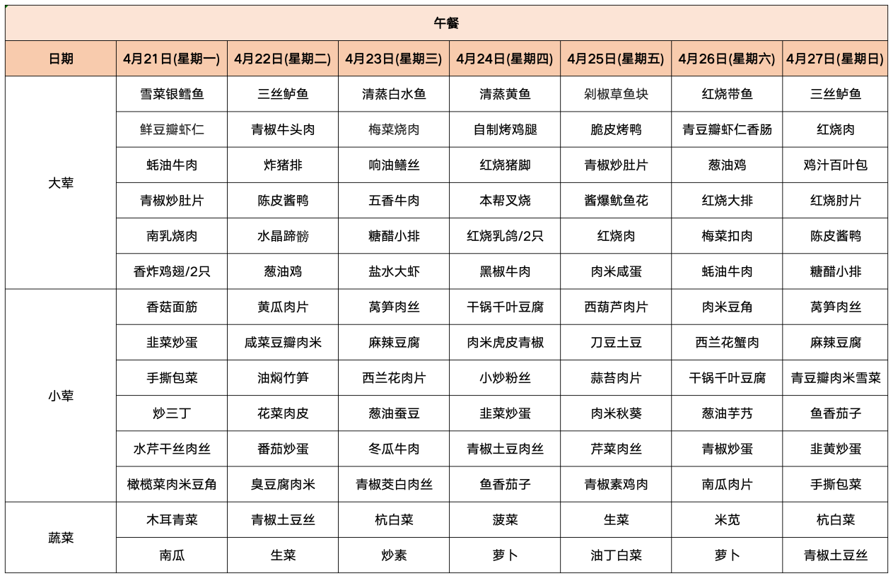 【TOP菜谱】桃浦社区食堂一周菜谱抢先看(4.21-4.27)