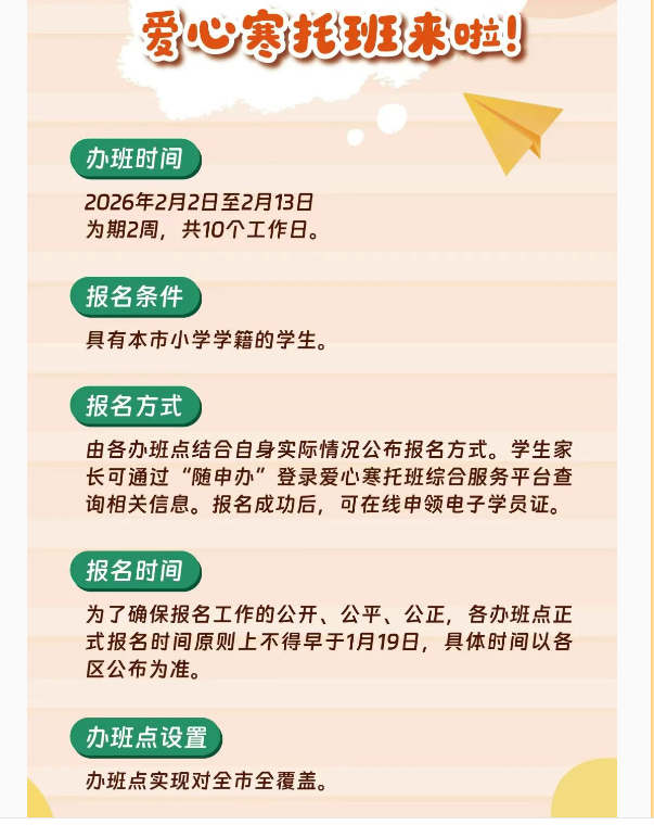 为积极践行人民城市理念,助力青年发展型城市和儿童友好城市建设,切实缓解本市小学生假期“看护难”问题,引导和帮助小学生度过一个安全、快乐、有意义的寒假,普陀团区委、普陀区教育局等单位决定2026年继续在全区范围内开设小学生爱心寒托班。