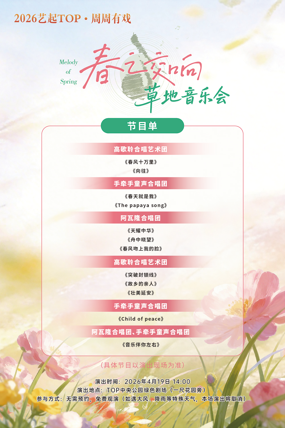 无需预约,免费观演(如遇大风、降雨等特殊天气,本场演出将取消)