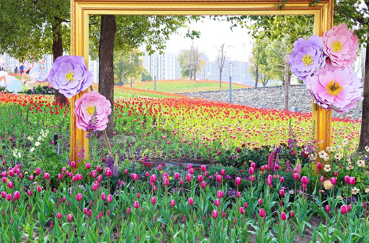 花海内共精选了18个郁金香品种,涵盖了从淡雅单色到繁重复色的多种色调。红色系的法国之光、世界火等,橙色系的世界真爱、阿德瑞母,白色系则选取兰卡、斯普利突破、纯金,紫色系为紫衣王子,桃红色系有范伊克、拉里贝拉,粉色系包括巨人粉、荷兰设计和粉色热情,此外还有门童、普利泽、肉色范伊克等晕染色系品种。这些品种高低错落、错落有致,在微风中摇曳生姿,为春日景观增添了丰富的层次感。