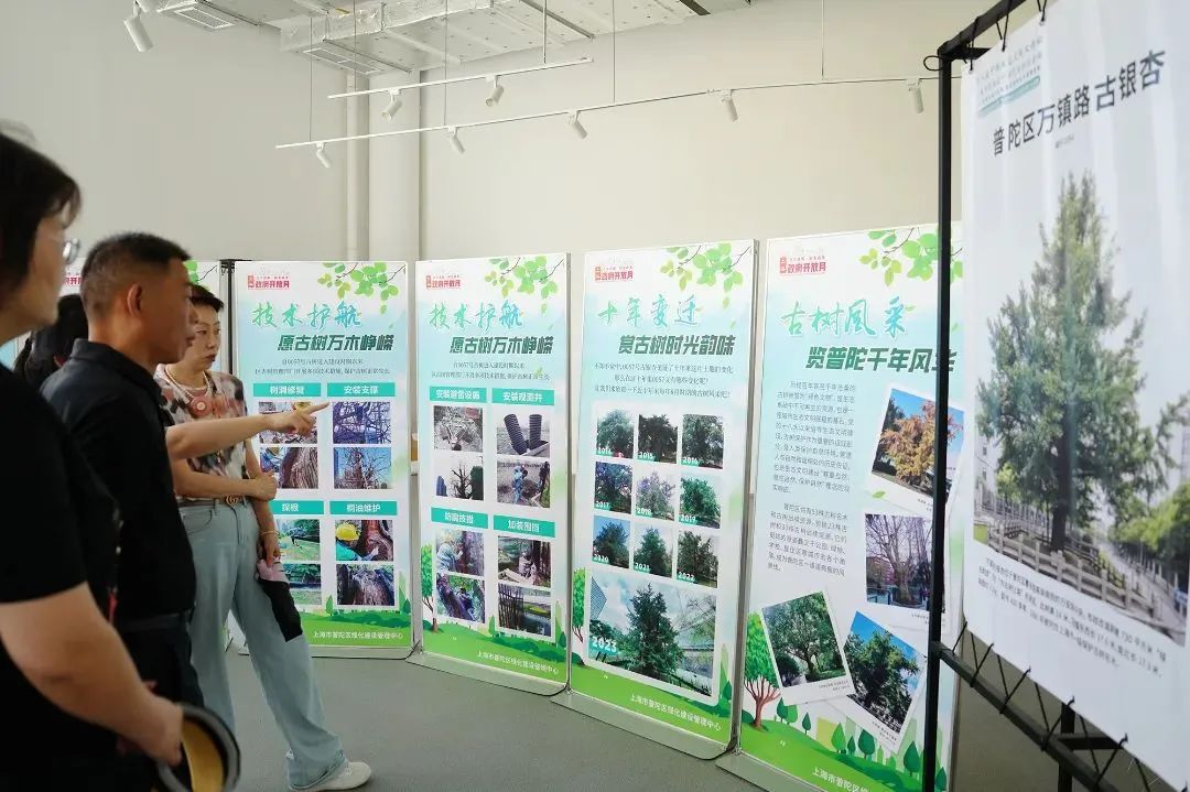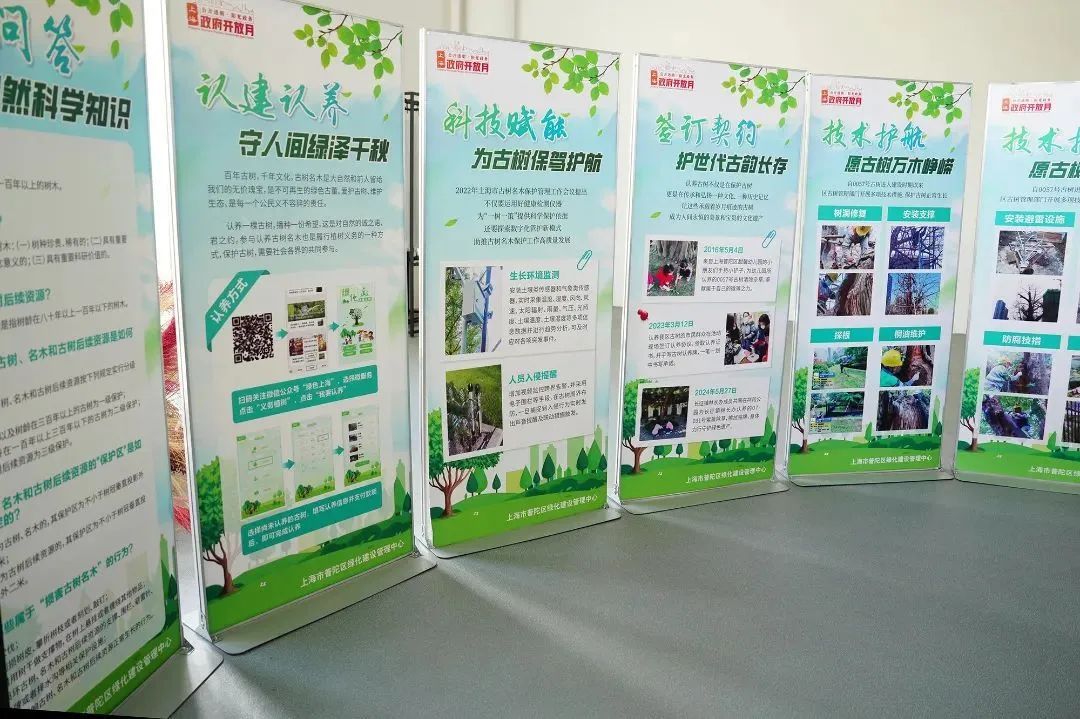 古树,宛如一部部珍贵的“活史书”,它们静静伫立在城市之中,见证着岁月的流转与城市的变迁。步入李子园公园展厅,区绿容局全面展示了辖区内23株古树名木的守护成果。其中,编号0057的古银杏格外引人注目,这株树龄已达500年的古树,是普陀区树龄第二的“老寿星”。多年来,相关部门不遗余力地对其进行悉心呵护,通过树洞修复、安装支撑、探根、安装围栏等一系列专业措施,为古树筑起了一道坚实的保护屏障。