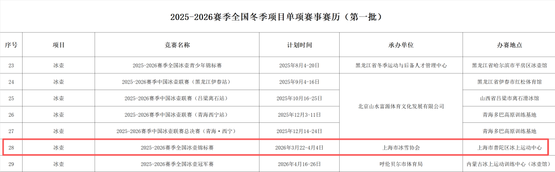 近日,国家体育总局冬季运动管理中心正式公布2025-2026赛季全国冬季项目单项赛事赛历(第一批)名单,根据名单显示——2025-2026赛季全国冰壶锦标赛将首度落“沪”。位于桃浦中央公园的上海普陀区冰上运动中心将成为比赛地。比赛日期为明年3月22日至4月4日。