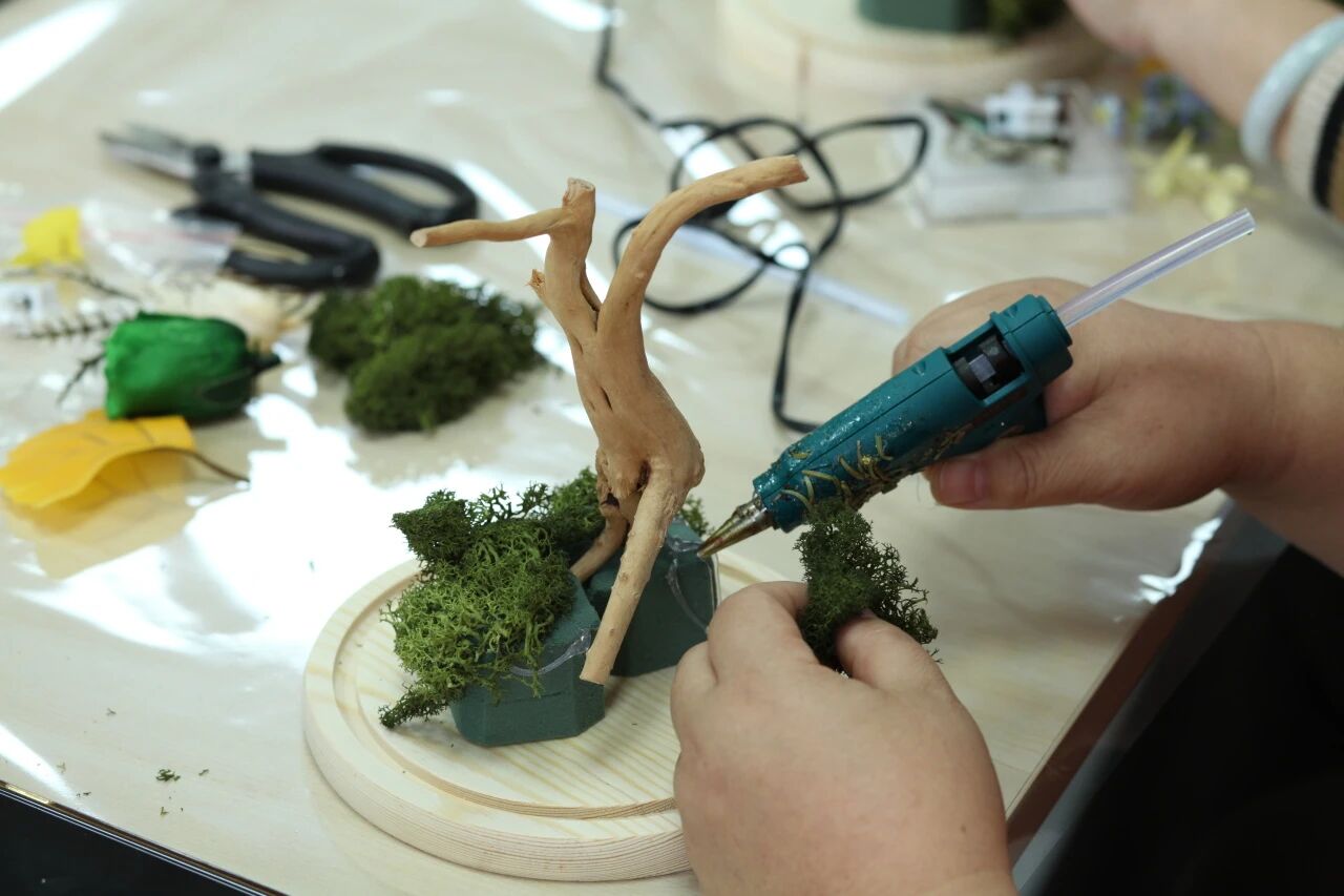 活动伊始,园艺师对蝴蝶标本玻璃罩生态微景观的制作流程与技巧进行了讲解与现场演示。在园艺师的引导下,参与者们兴致盎然地投入创作。首先进行基底铺设,使用热胶枪将花泥与树枝固定,再铺满苔藓,构建树枝造型,随后用热熔胶枪将树叶、永生花固定于树枝之间,自由设计出错落有致的趣味场景,使瓶中“森林”初现雏形。