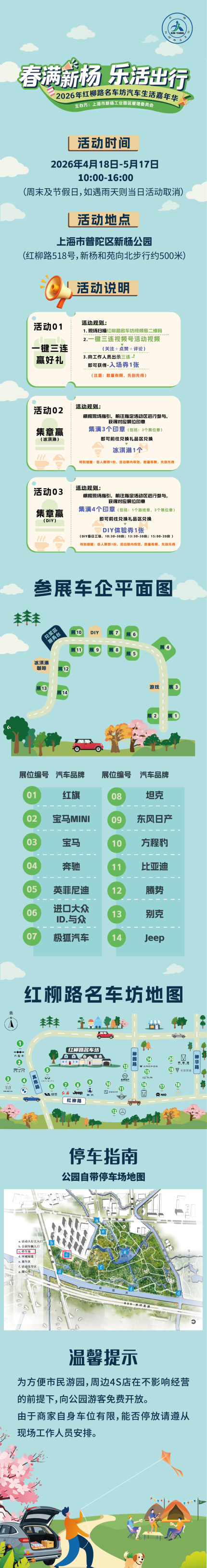 在刚刚过去的周末,新杨公园(红柳路518号)内人头攒动、笑语盈盈,“春满新杨 乐活出行”2026年红柳路名车坊汽车生活嘉年华在这里欢乐启幕。作为桃浦镇新杨园区重点培育的汽车消费地标,红柳路名车坊此次联动14家入驻及合作汽车品牌,将名车展示、亲子游乐与春日游园巧妙融合,打造出一个可逛、可玩、可沉浸体验的“车生活”生态圈。据统计,仅开幕周末两日就吸引超万名市民游客前来打卡,各品牌累计收获有效留资逾百组,实现人气与口碑双丰收。