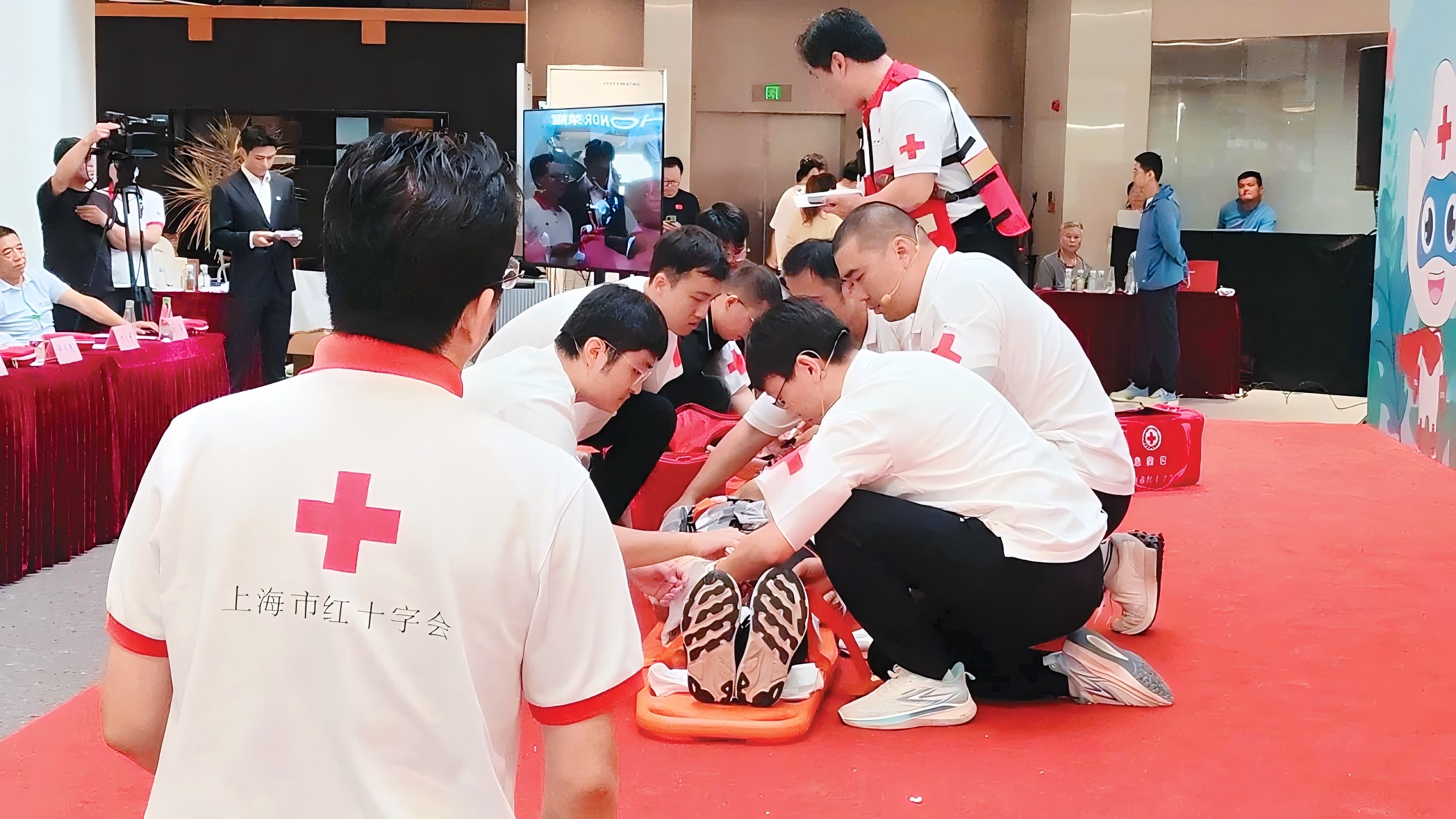活动现场,来自区游泳协会和上海洛合体育发展有限公司的两支群众救护队同台比拼应急救护技能。参赛队员分别进行心肺复苏+自动体外除颤仪AED、止血包扎、骨折固定、特殊伤处理和伤员搬运五类项目的较量(右图)。经过激烈角逐,最终普陀区游泳协会救护队获得比赛胜利。