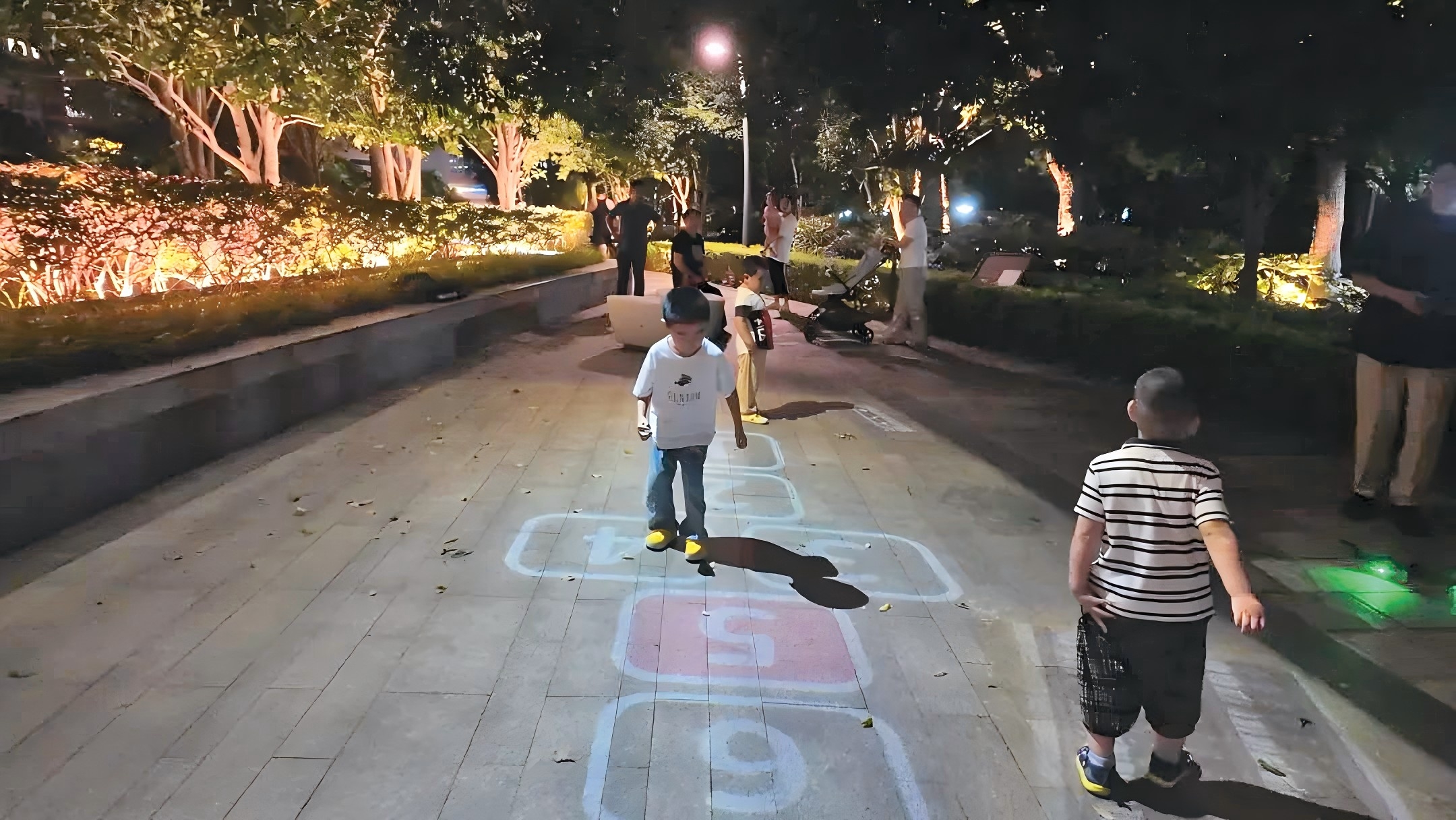 在半岛花园13号楼旁,一套光影设备不仅能投射出各类光影秀,还能够精准识别市民的脚步动作,产生有趣的互动效果。充满童年回忆的“跳房子”“滚铁环”等7种互动投影游戏,吸引着大小朋友在方格上欢快地跳跃。