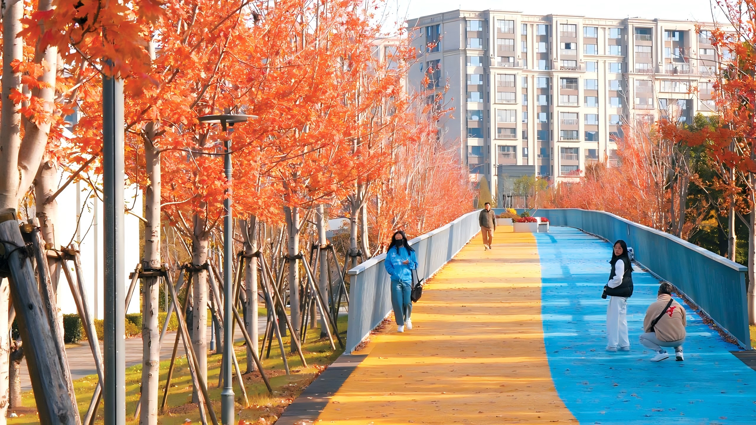 半马苏河云岭公园枫叶如火,引来市民赏景拍照