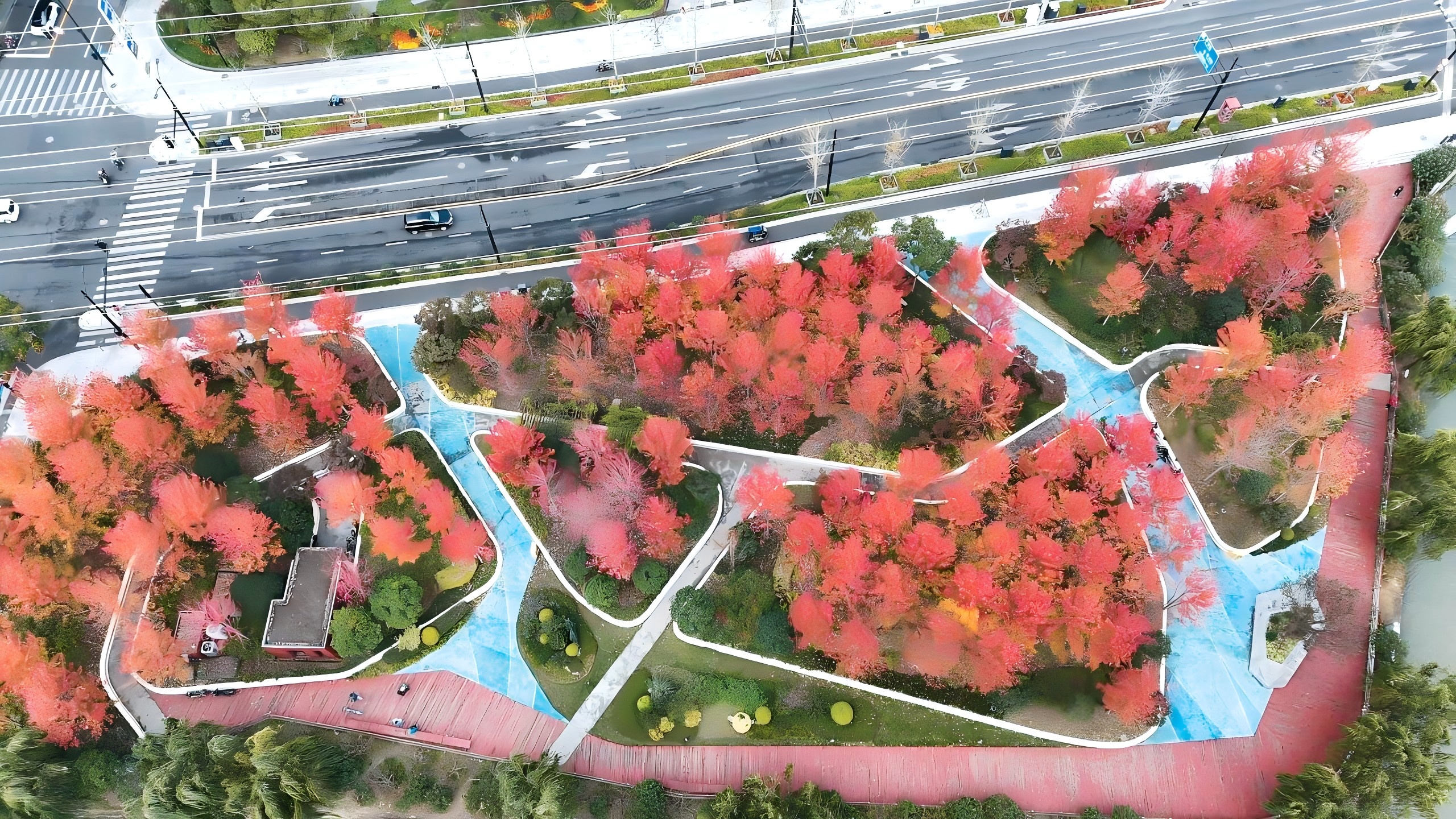 俯瞰静宁绿地,满园枫叶构成了一幅绚丽多彩的画卷