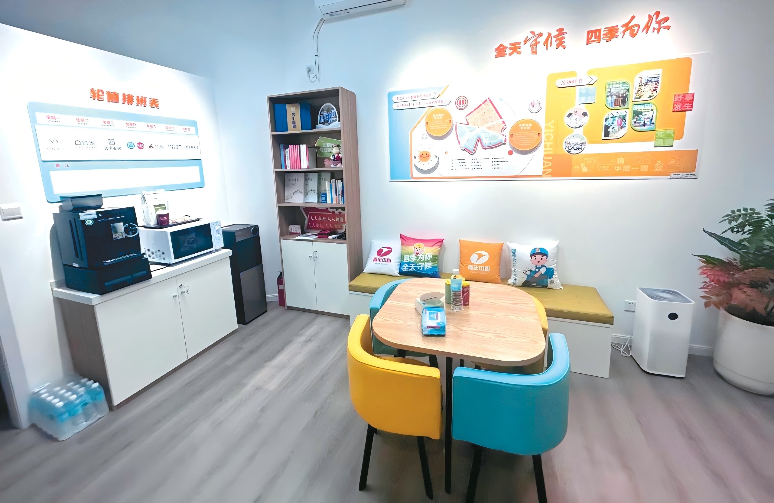 考虑到职工的具体需求,休息室还针对女职工开辟了一个私密空间,方便更换工服等。在这个空间里,最亮眼的莫过于一面手绘墙,“全天守候,四季为你”的字句与守候各行职工的暖心绘图,让这一角落顿感温馨。手绘墙的作者是来自街区治理共同体的单位成员——长宁美校,而除了这面墙,整个空间的布置都凝聚了多方成员的一份力量。