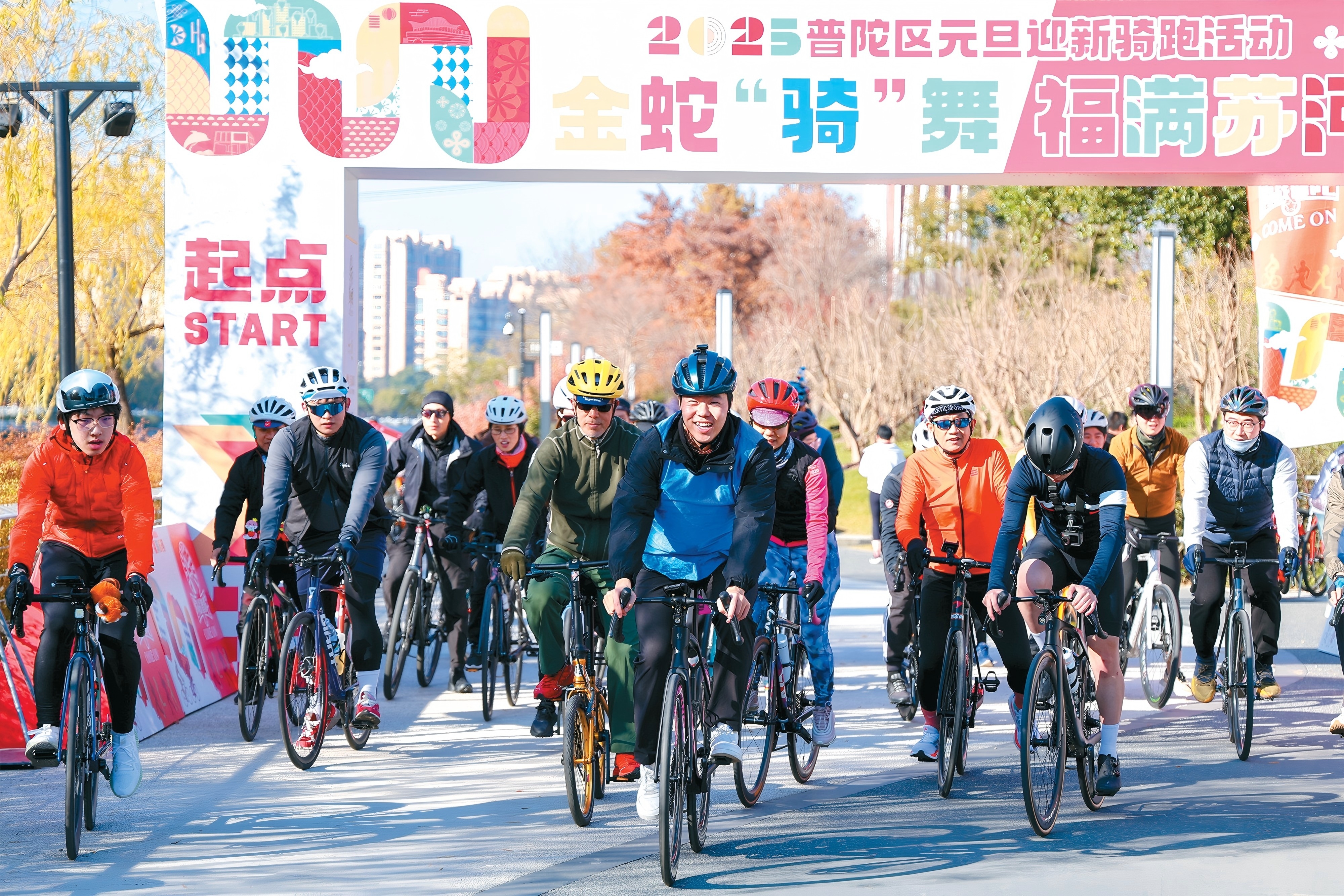 本报讯 1月1日,伴随着精彩的新年街舞秀,“金蛇‘骑’舞 福满苏河”2025年普陀区元旦迎新活动在半马苏河公园火热开启。区领导们和200名运动爱好者有序出发,共同参与这场充满活力的迎新骑跑活动。