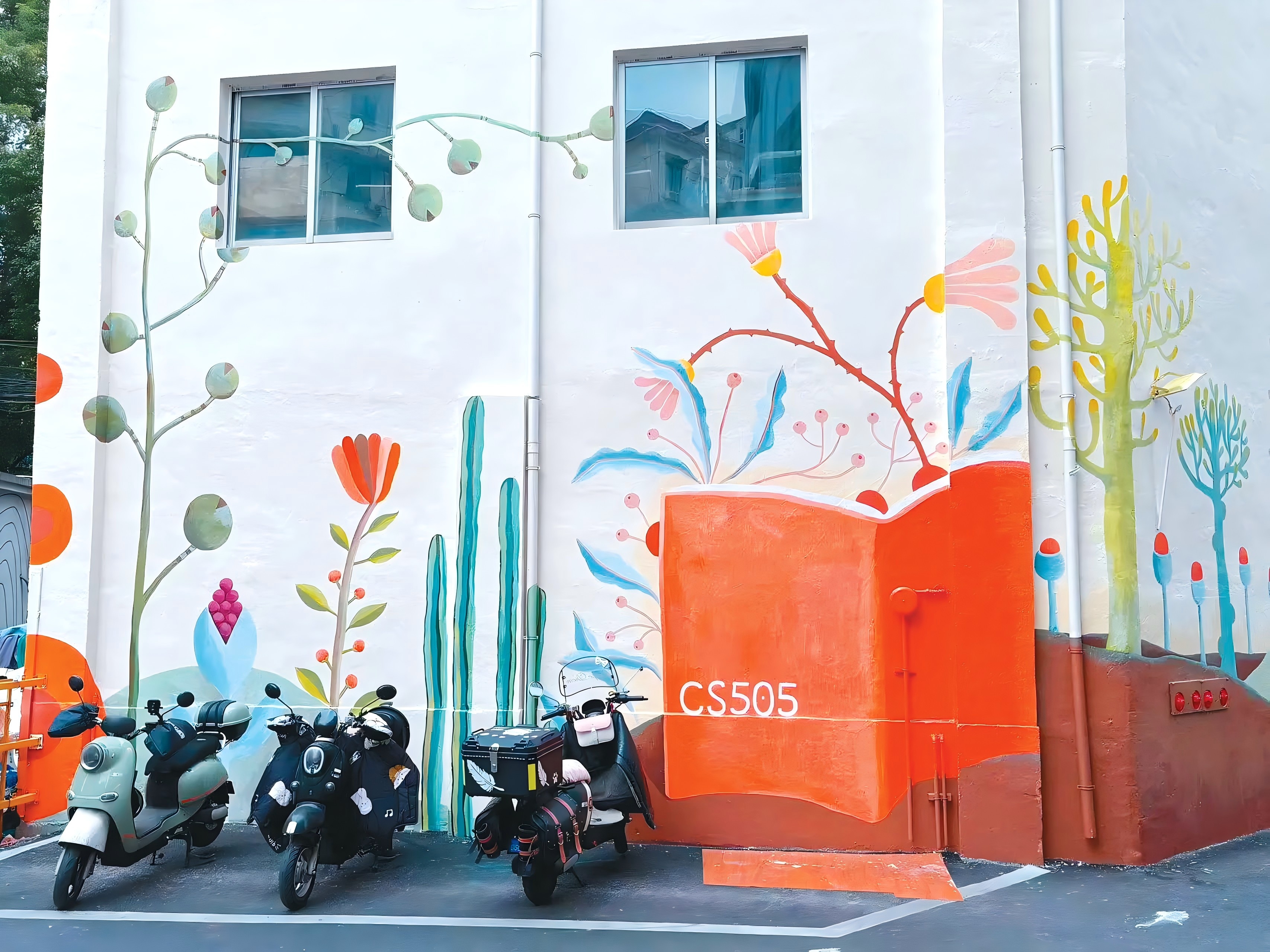 长寿路街道社会组织——臻意雅创艺术工作室接下墙绘图案设计任务。工作室插画师Berta融合周边环境及长寿文化特色,设计出了体现人与自然和谐共生的墙绘图纸。